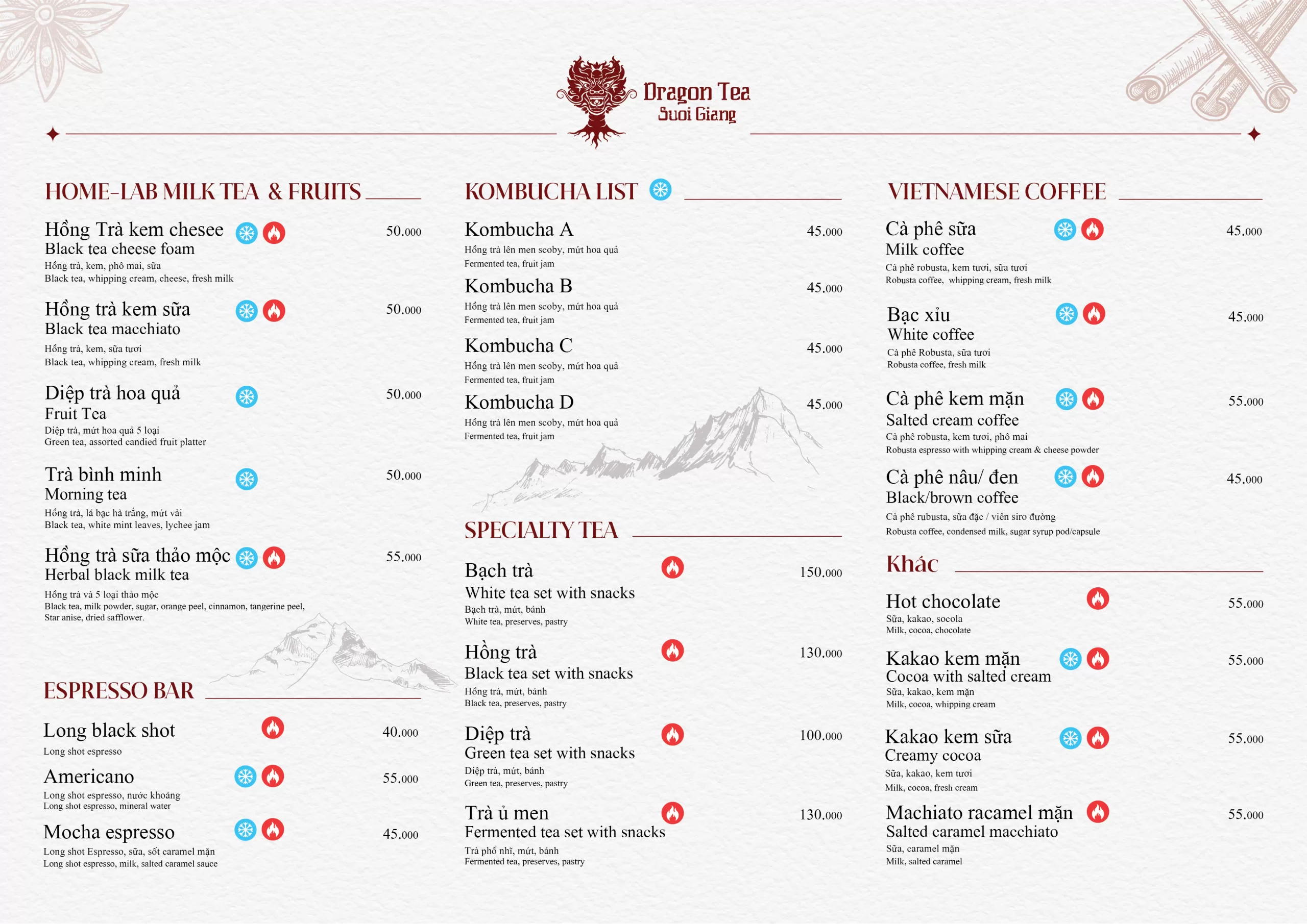 Tea Bar tại The Legend Of Dragon Tea Suối Giàng là nơi trà Shan tuyết được thể hiện theo một cách mới mẻ và gần gũi hơn. Không chỉ dừng lại ở trà truyền thống, không gian này mang đến những thức uống hiện đại được biến tấu từ trà, kết hợp hài hoà giữa hương vị bản địa và phong cách thưởng thức đương đại.